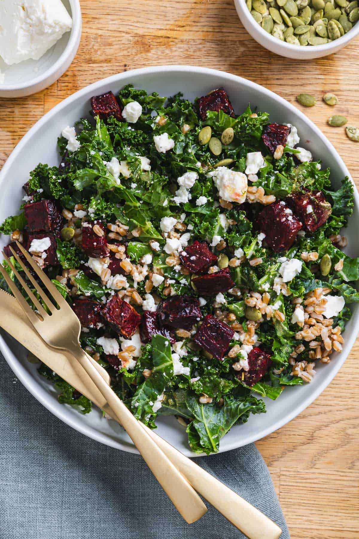 - Assemble Salad: To assemble salad, place kale in a large mixing bowl and pour on half the dressing. Toss well and allow to sit for 5 to 10 minutes. Add beets, farro, crumbled feta cheese, and pumpkin seeds. Toss well. Add more dressing, if desired, and serve with more feta cheese and pumpkin seeds.