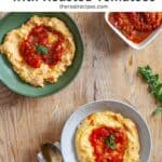 A couple bowls with cheesy polenta topped with smashed roasted tomatoes and oregano.