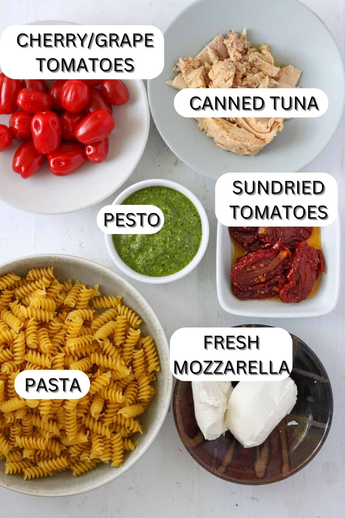 - Transfer pasta to a large mixing bowl and add ½ cup pesto. Toss to combine. Add sundried tomatoes and 1 tablespoon of oil from the jar and gently toss. Add cherry tomatoes and mozzarella and toss to combine. Add tuna (see note) and gently toss until just combined. Serve warm, room temperature or cold (see note). Just before serving, add remaining ¼ cup pesto and reserved pasta water, (if needed) to thin out sauce. Garnish with fresh basil leaves.