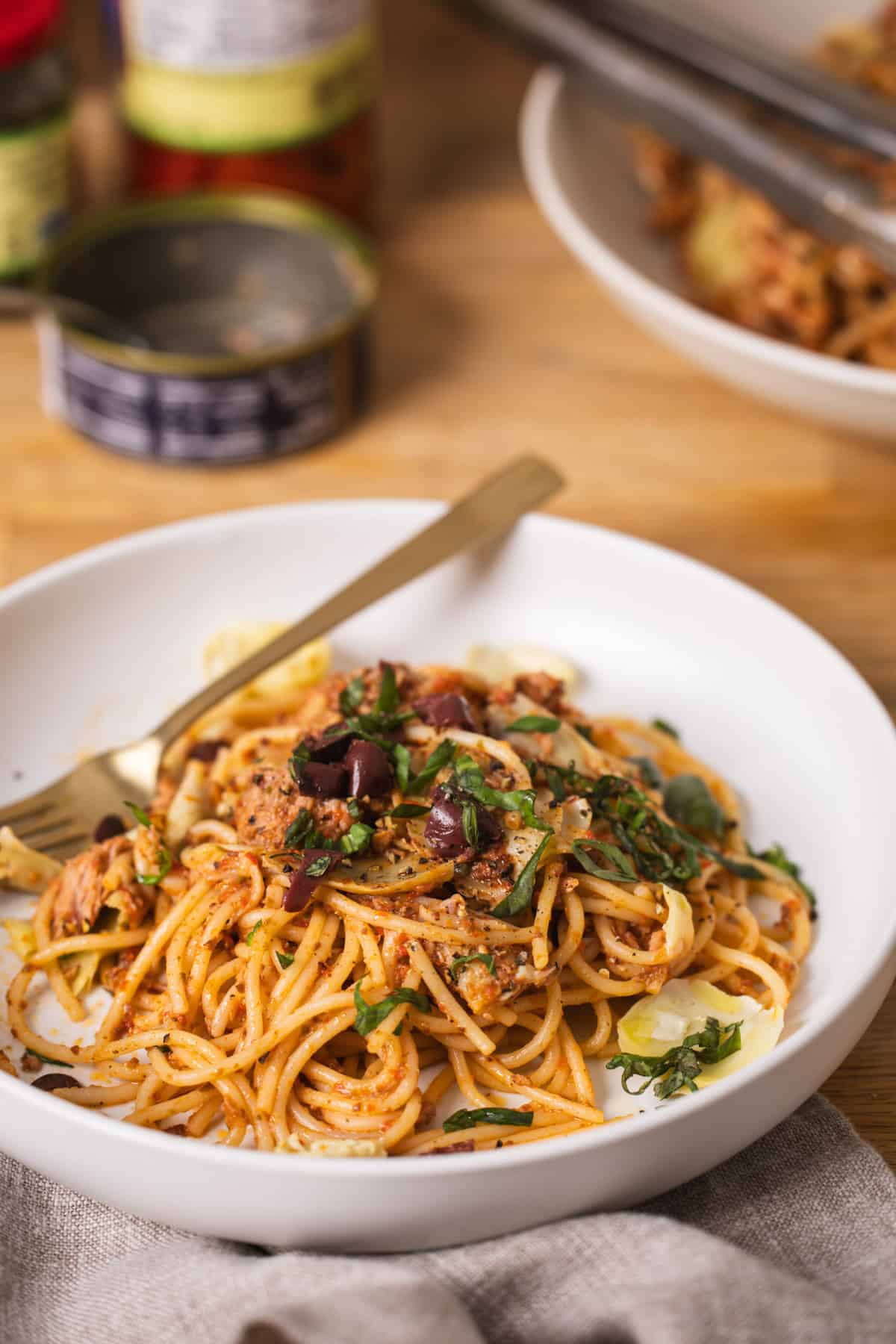 - Toss and Finish: Toss the pasta with the sauce. Add torn artichoke hearts and canned tuna (add oil from tuna, if desired). Gently toss and serve. Adjust consistency with reserved pasta water. Garnish with olive oil, black pepper, olives, and fresh basil, if desired.